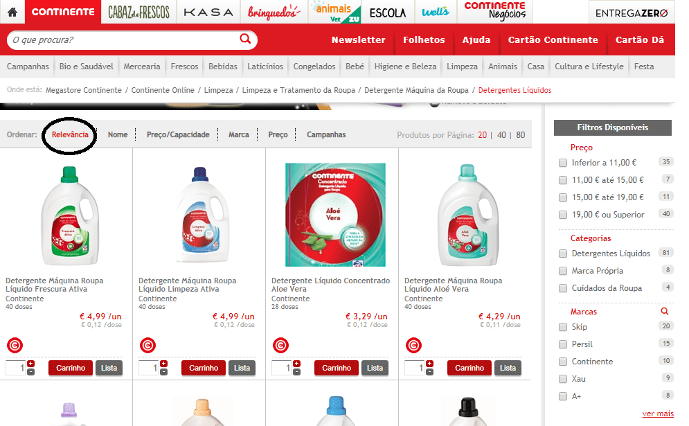 Ordenando por ”Preço/Capacidade” encontro o detergente líquido mais barato vendido no Continente. Porém, não é aquele que mais me agrada. O que fazer a seguir? Muito simples, fazer scroll encontrando o produto que mais gosto ao melhor preço daquele supermercado. Neste caso é uma questão Custo/Benefício.
