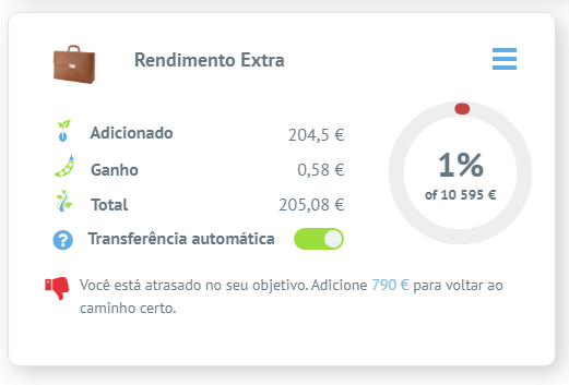 Eu, pessoalmente estabeleci um objetivo de ter na plataforma 10.000€ acumulados. Com isso, defini o objetivo ”Rendimento Extra”, defini um prazo para ter esse valor e é isso. Vou enviando para lá uma percentagem do dinheiro que pretendo investir durante o mês e depois é só observar como todos os dias o dinheiro vai rendendo na minha conta.